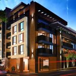 The building’s design is original. The façade features vertical elements that taper at a slight angle, conveying a sense of lightness and elegance. These elements transition into terraces that telescope outward from the solid horizontal zones around the windows.