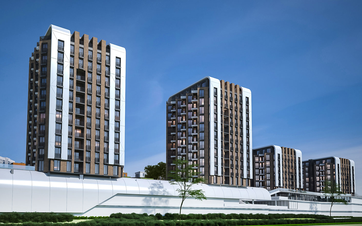 The main volumes will be clad in clinker to correspond with the nearby industrial zone. Two bands of white composite panels are designed to frame the buildings, curving at the top to create an elegant silhouette. In addition to the large apartment terraces, many areas feature small balconies that run in front of the French windows, adding rhythm to the façade and serving as fire barriers, which are mandatory for high-rise buildings.