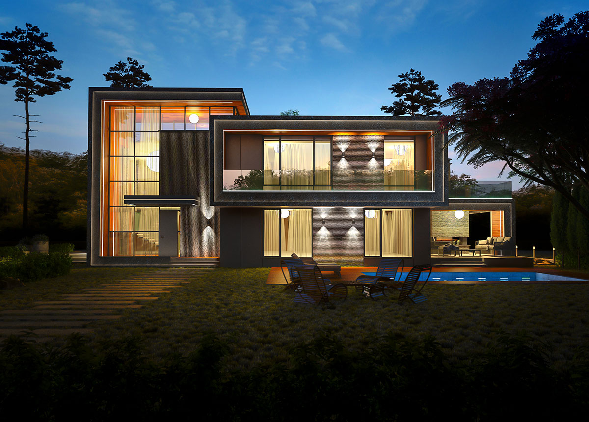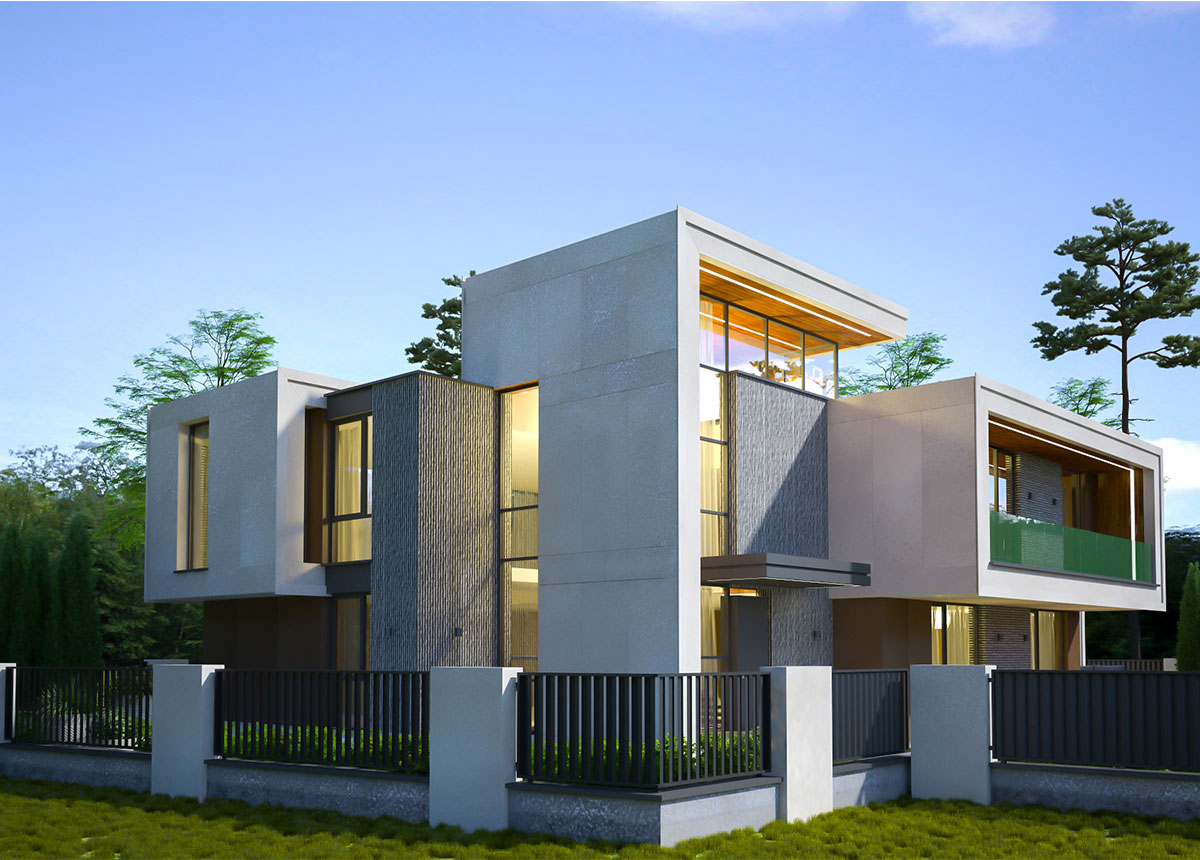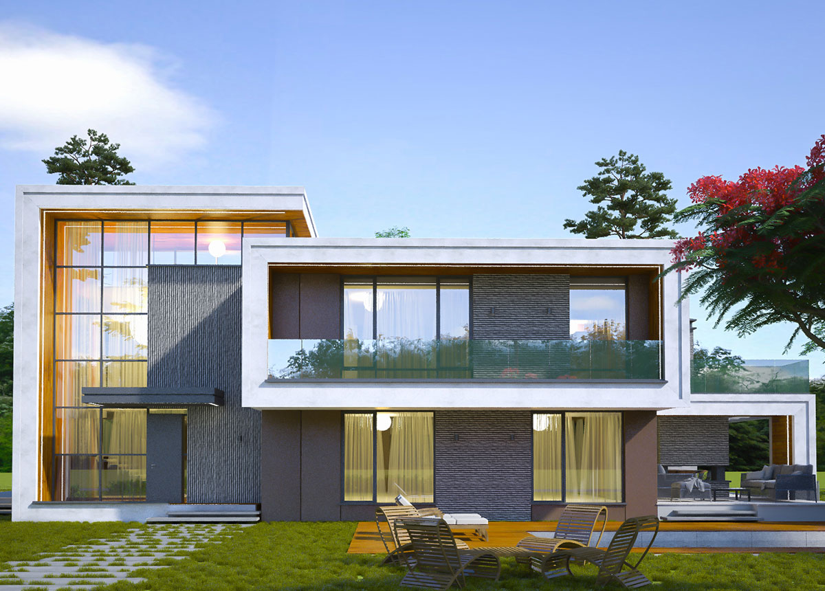Архитектурата е композиция от правоъгълни обеми, раздвижени така, че да се акцентира върху различните функционални зони. Акцент се явява съответно входния вестибюл, който е през няколко етажа. Така също е наблегнато на родителската спалня, както и на верандта. Материалите по фасадата са основно широкофарматен гранитогрес, като на места има акценти от композитна облицовка с хоризонтален и вертикален растер.