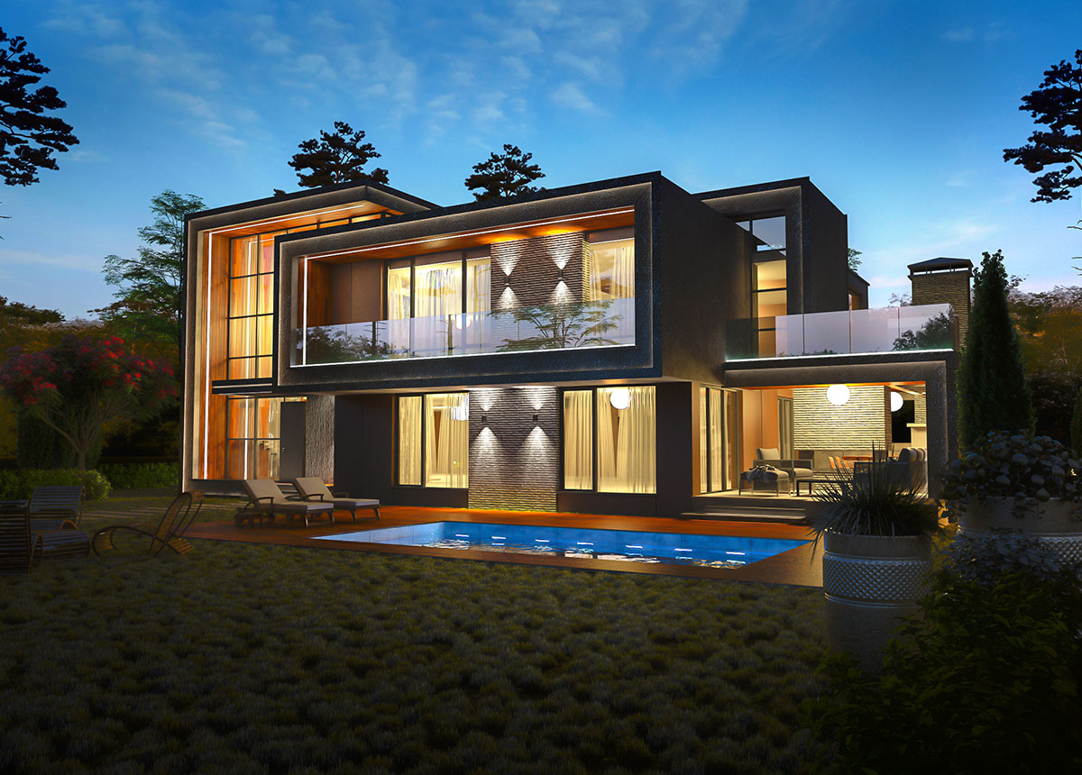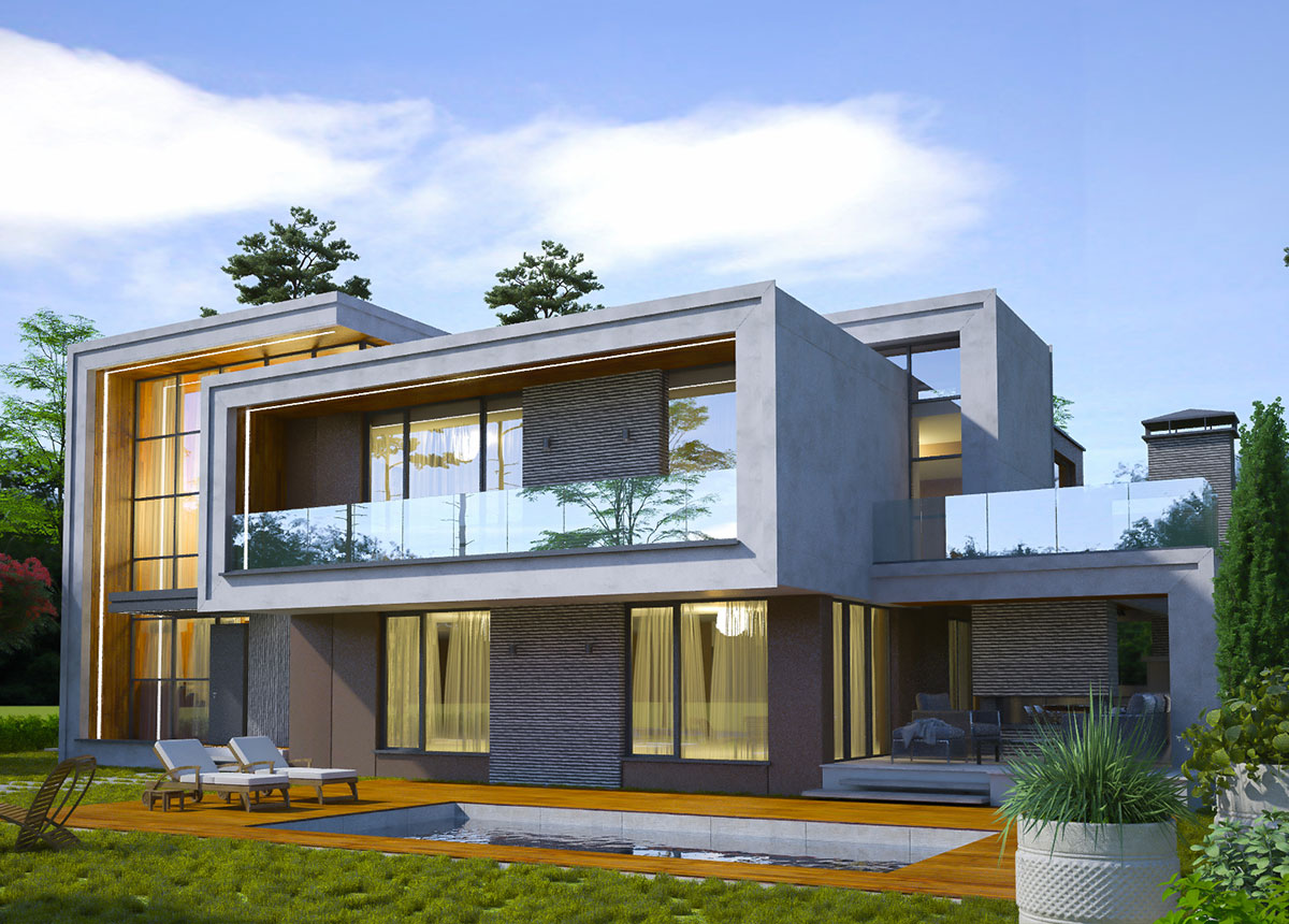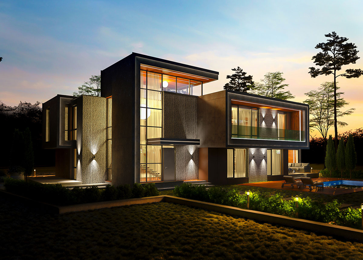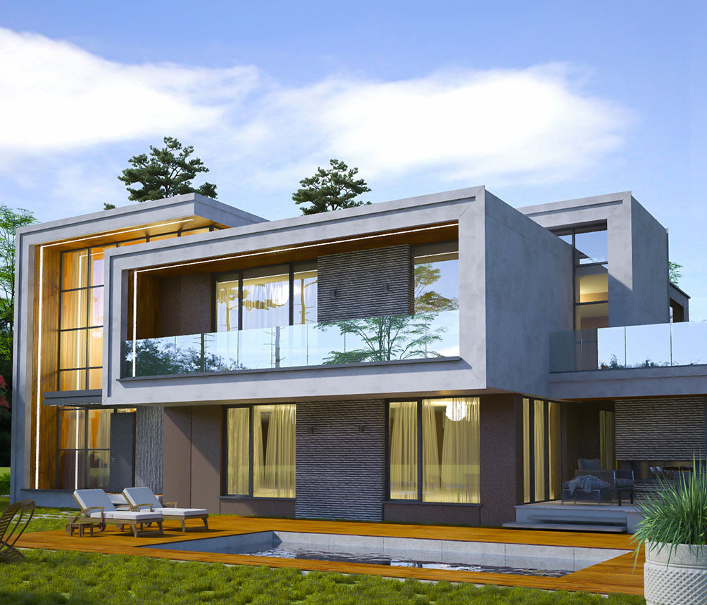 Архитектурата е композиция от правоъгълни обеми, раздвижени така, че да се акцентира върху различните функционални зони. Акцент се явява съответно входния вестибюл, който е през няколко етажа. Така също е наблегнато на родителската спалня, както и на верандта. Материалите по фасадата са основно широкофарматен гранитогрес, като на места има акценти от композитна облицовка с хоризонтален и вертикален растер.